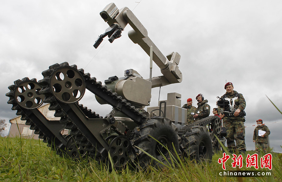 當(dāng)?shù)貢r(shí)間5月18日,德國南部哈默爾堡舉行了歐洲軍用機(jī)器人大賽。歐洲各國軍用機(jī)器人在大賽上一展身手。圖片來源:中國新聞網(wǎng)
