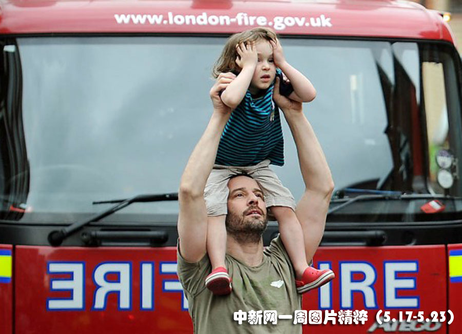5月19日,一名男子托起小孩觀看消防隊員撲滅倫敦公寓屋頂?shù)拇蠡。該公寓嚴重受損,但無人受傷。
