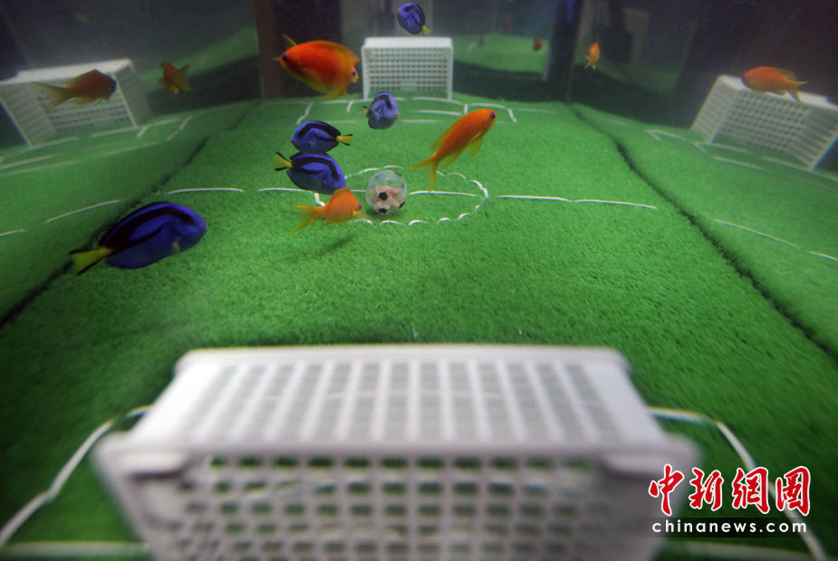 5月23日,日本橫濱八景島海洋世界水族館中,一群魚兒在“踢足球”,藍色魚代表日本隊,橘色魚代表荷蘭隊。在2010年南非“世界杯”上,日本將迎戰(zhàn)荷蘭隊。
