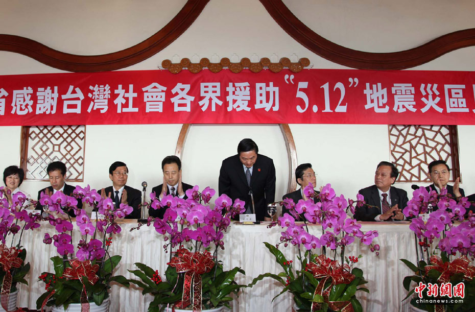 5月24日下午,“四川省感謝臺(tái)灣社會(huì)各界援助‘5.12’地震災(zāi)區(qū)見(jiàn)面會(huì)”在臺(tái)北圓山飯店舉行,首度訪臺(tái)的中共四川省委書(shū)記劉奇葆于致辭時(shí),兩度鞠躬感謝臺(tái)灣同胞積極援助四川災(zāi)區(qū),展現(xiàn)出血濃于水的同胞大愛(ài)。 中新網(wǎng)記者董會(huì)峰攝