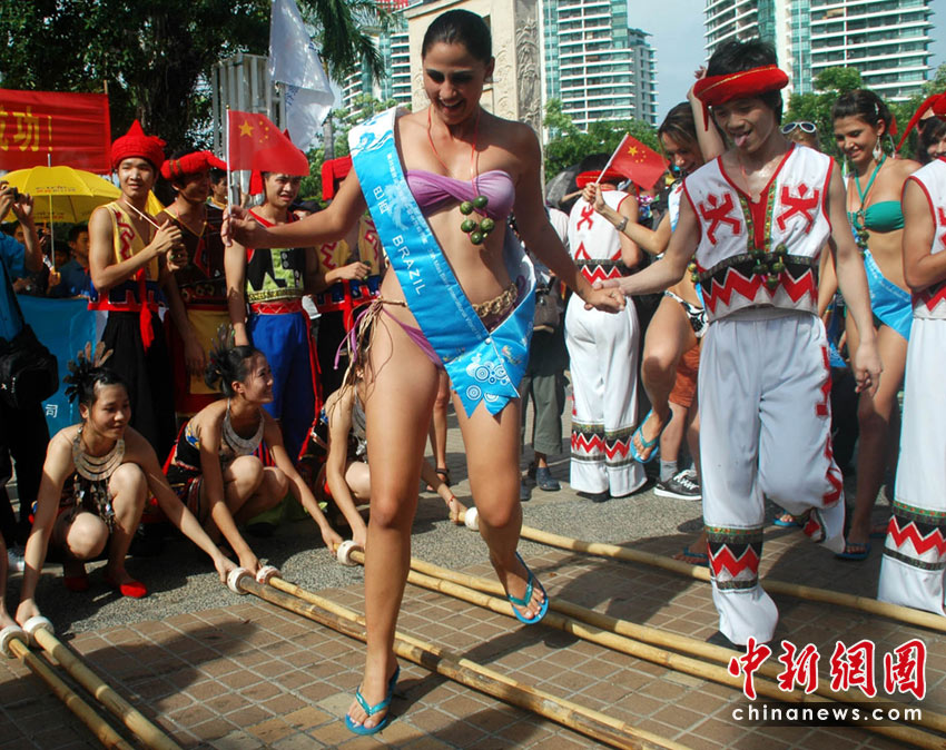 5月23日,全球64位比基尼佳麗們參加了三亞“清涼一夏 文化三亞”夏季旅游促銷活動(dòng)的啟動(dòng)儀式及系列主題活動(dòng),與三亞市民和游客親密接觸,跳起了歡快的竹竿舞,并乘豪華游艇暢游三亞。中新社記者 尹海明 攝