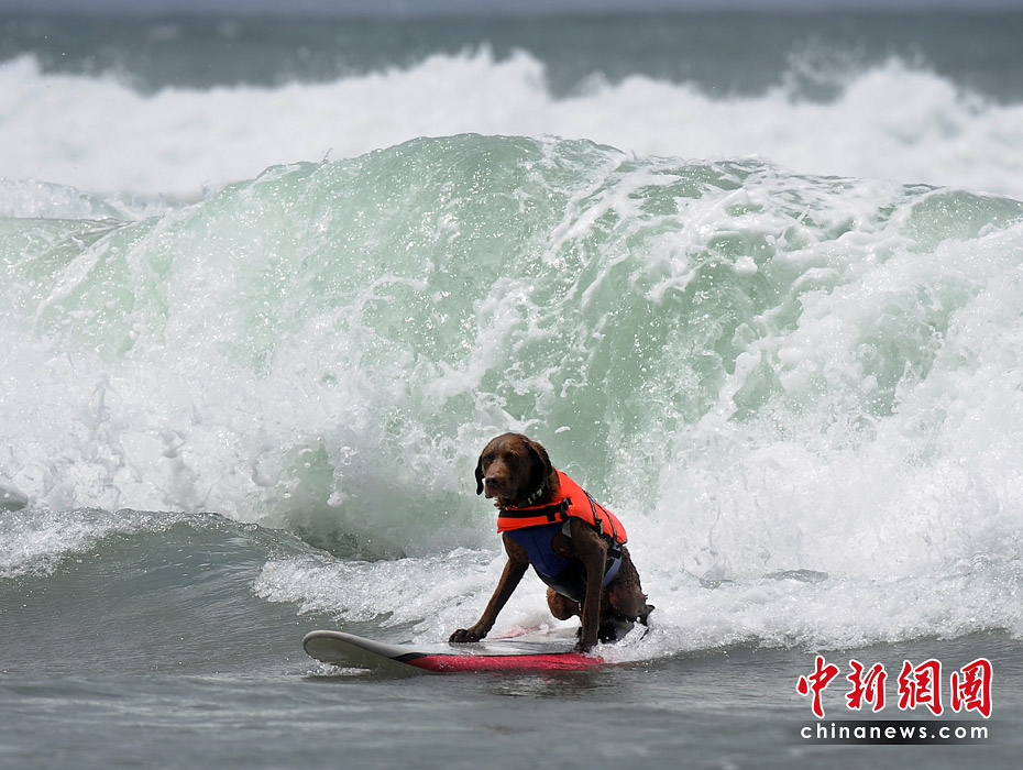 5月22日,美國加利福尼亞州圣迭戈舉行了一場妙趣橫生的狗狗沖浪比賽。圖片來源:中國新聞網(wǎng)