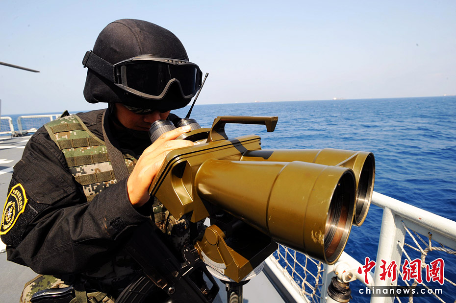 特戰(zhàn)隊員使用高倍望遠鏡觀察瞭望。江山 攝