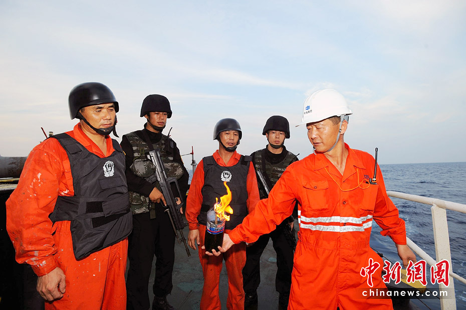 船員在特戰(zhàn)隊員的指導(dǎo)下,進(jìn)行自制燃燒彈的投擲訓(xùn)練。江山 攝