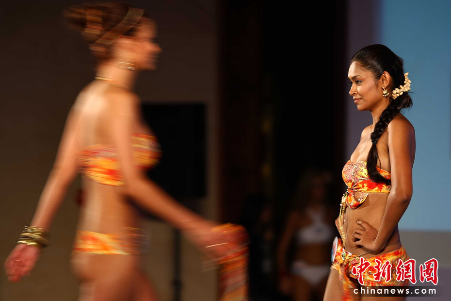 5月24日晚,在海南三亞參加第35屆國(guó)際比基尼小姐全球總決賽的64位各國(guó)佳麗們,展開(kāi)了比基尼泳裝DIY設(shè)計(jì)和最佳身材的比拼。最終來(lái)自西班牙與烏克蘭的組合Marrero和Struk獲得了泳裝DIY設(shè)計(jì)的金獎(jiǎng)。泰國(guó)佳麗Prapahan摘得最佳身材的桂冠。圖為佳麗們?cè)谡故咀约涸O(shè)計(jì)的泳裝。中新社記者 富田 攝