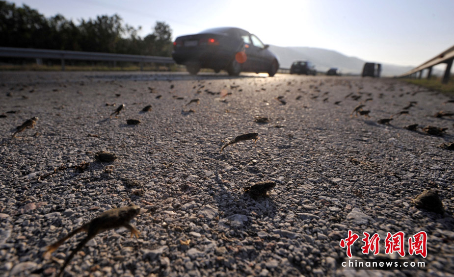 26日,希臘東北部地區(qū)的一條高速公路遭數(shù)百萬只青蛙“占據(jù)”而被迫關(guān)閉了兩個小時。希臘環(huán)保部門表示,這些青蛙可能只是在前往附近小湖找食物過程中“碰巧路過”高速公路。