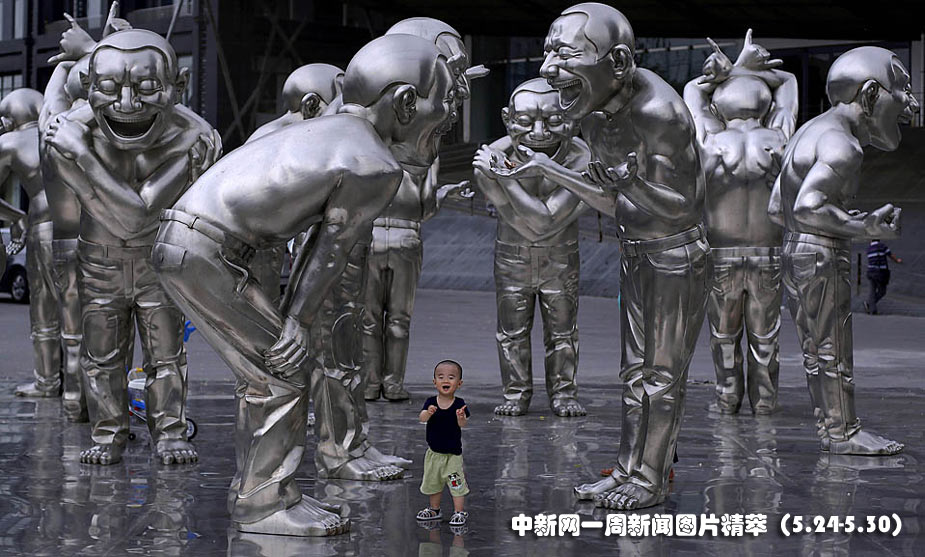 26日(周三),北京,一名小童在北京今日美術館的雕塑前玩耍。