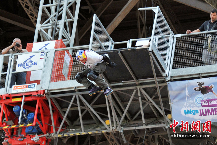 5月29日,法國巴黎,法國極限直排輪冠軍克里斯(Taig Khris)從法國艾菲爾鐵塔跳下,創(chuàng)下世界新自由落體紀錄。
