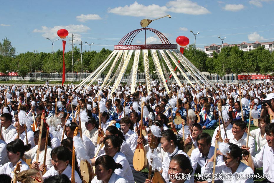 5月30日,新疆托里縣28個民族10495人共同參加冬不拉樂器表演,創(chuàng)下上海吉尼斯世界紀錄。萬人同奏的哈薩克族樂曲名為《凱乃斯》,漢語意為“和諧”。圖片來源:中國新聞網>>點擊觀看詳細內容