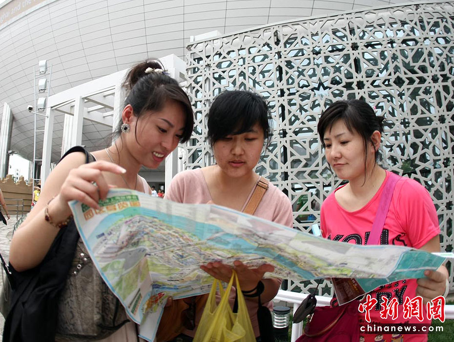 截至6月5日19點30分,上海世博會累計參觀者已超過1000萬人次。據(jù)悉,上海世博會的規(guī)劃用地為5.28平方公里,約242個國家和國際組織參展分布在浦東和浦西兩大區(qū)域。要想在這么大的地方找到自己想去的地方,那么世博地圖就是必須的裝備。圖為上海世博園內(nèi)游客正在地圖上尋找自己要去的地方。中新社記者 杜洋 攝