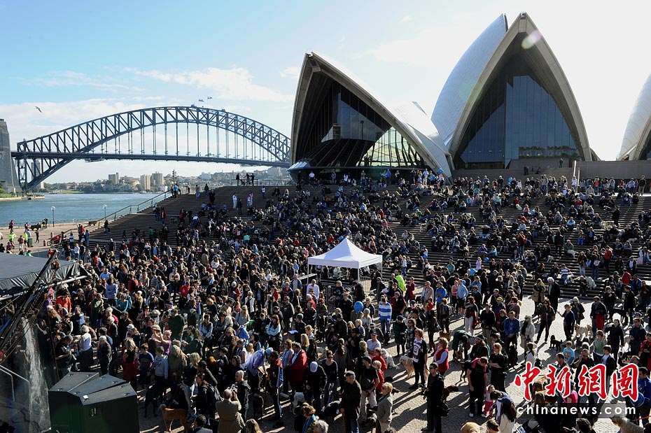 6月5日,澳大利亞悉尼歌劇院外舉辦了全球首場狗能聽懂的音樂會,約有1000人帶著數(shù)百只愛犬在劇院前庭和階梯落坐,聆聽“狗的音樂”,整場音樂會全長20分鐘。圖片來源:中國新聞網(wǎng)