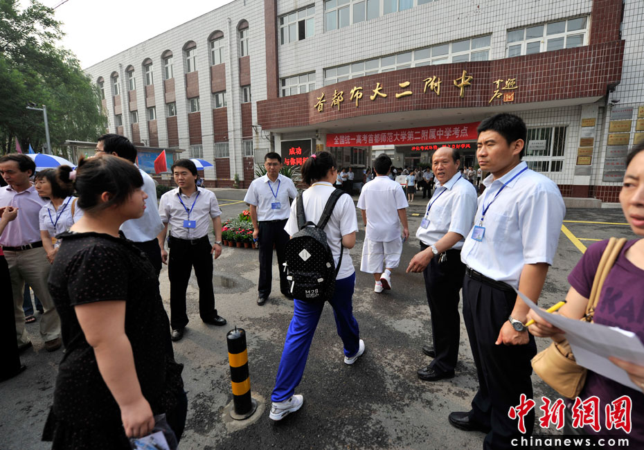 2010年全國高考6月7日日拉開大幕,957萬考生走進(jìn)考場。由于報名人數(shù)減少,而招生計劃增加,教育部預(yù)計今年全國高考平均錄取率將會增加近7%。圖為首都師范大學(xué)第二附屬中學(xué)考點。中新網(wǎng)記者 金碩 攝
