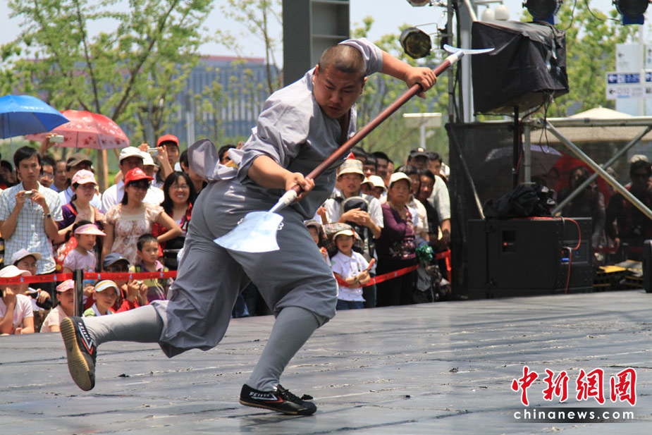 自5月1日開始,上海世博園D片區(qū)綜藝廣場每天都有少林寺功夫展演,受到世博參觀者的熱捧。中新社記者 殷春永攝