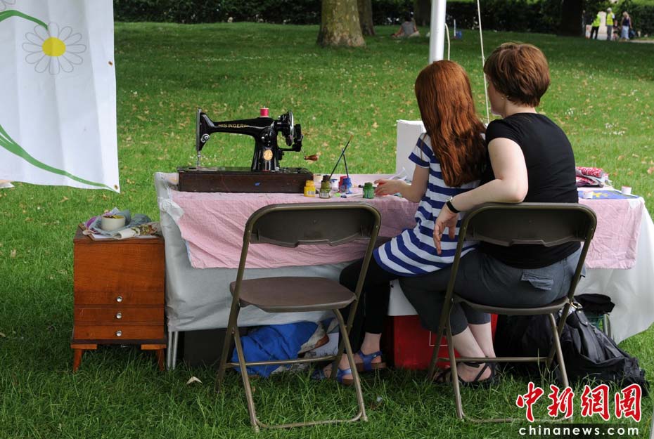 當(dāng)?shù)貢r(shí)間2010年6月6日,英國(guó)倫敦舉行卡姆登綠色市集(Camden Green Fair),這是英國(guó)倫敦每年環(huán)保領(lǐng)域的“重頭戲”。本屆市集的主旨是要喚起大眾對(duì)環(huán)境問(wèn)題的關(guān)注,選擇更加可持續(xù)發(fā)展的生活方式。據(jù)活動(dòng)主辦方預(yù)計(jì),本屆市集將吸引來(lái)自英國(guó)各地和世界各國(guó)的2萬(wàn)多人參加。圖為一對(duì)母女在做手工。桌子上的老式縫紉機(jī)讓人有重回舊時(shí)光的感覺(jué)。Fiona/攝 Fiona 馬小剛/文