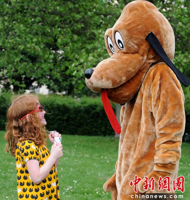 當(dāng)?shù)貢r(shí)間2010年6月6日,英國倫敦舉行卡姆登綠色市集(Camden Green Fair),這是英國倫敦每年環(huán)保領(lǐng)域的“重頭戲”。本屆市集的主旨是要喚起大眾對(duì)環(huán)境問題的關(guān)注,選擇更加可持續(xù)發(fā)展的生活方式。據(jù)活動(dòng)主辦方預(yù)計(jì),本屆市集將吸引來自英國各地和世界各國的2萬多人參加。圖為素食推廣志愿者扮成卡通狗吸引孩子。Fiona/攝 Fiona 馬小剛/文