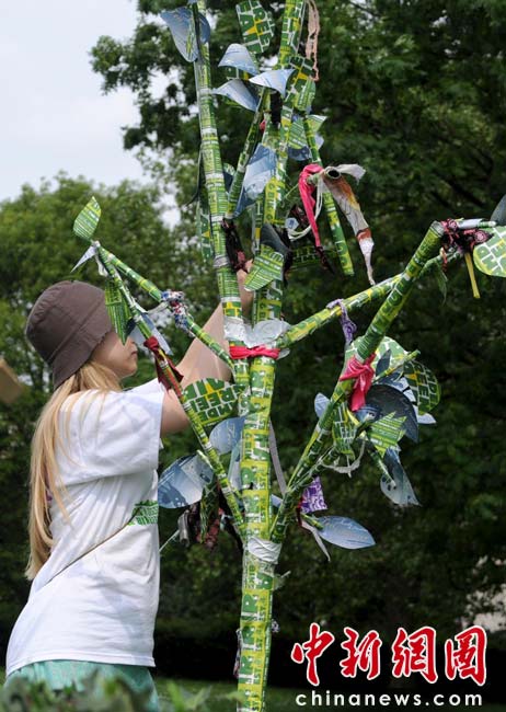 當(dāng)?shù)貢r間2010年6月6日,英國倫敦舉行卡姆登綠色市集(Camden Green Fair),這是英國倫敦每年環(huán)保領(lǐng)域的“重頭戲”。本屆市集的主旨是要喚起大眾對環(huán)境問題的關(guān)注,選擇更加可持續(xù)發(fā)展的生活方式。據(jù)活動主辦方預(yù)計,本屆市集將吸引來自英國各地和世界各國的2萬多人參加。圖為用回收的廢舊紙張制作的“小樹”。該樹由年輕的倫敦園藝設(shè)計師Sarah Veniard設(shè)計。她的設(shè)計理念是“美麗的可持續(xù)空間”。她認(rèn)為只要有充足的陽光,陽臺也可以變成一個集水果蔬菜和觀賞植物于一身的多功能花園。Sarah是純素食主義者,她結(jié)合顧客要求設(shè)計的瓜果園非常受歡迎。Fiona/攝 Fiona 馬小剛/文