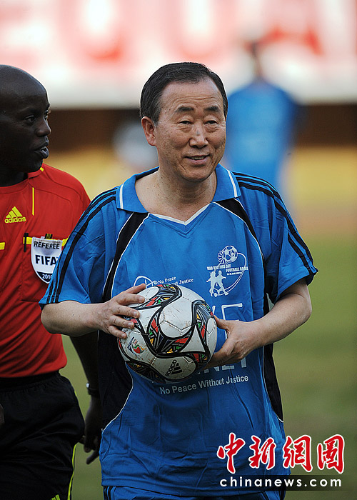 圖為2010年5月30日,聯(lián)合國秘書長潘基文在曼德拉國家體育場參加足球賽。