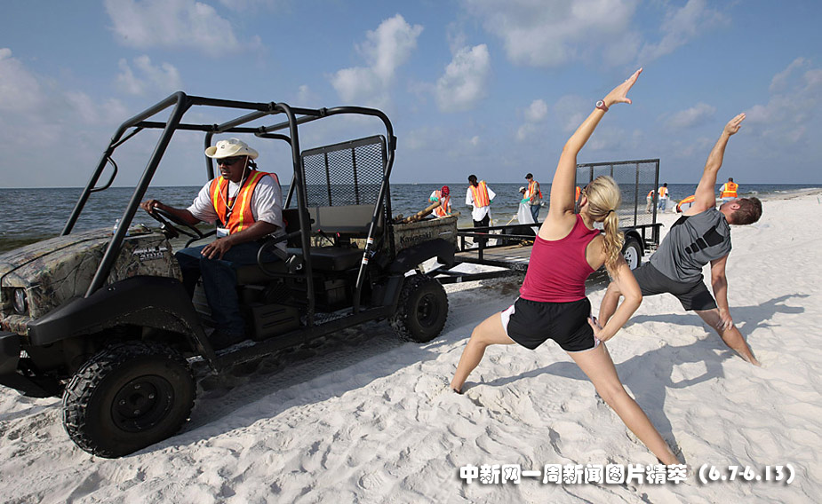 周三(9日)在美國阿拉巴馬州奧蘭治海灘,英國石油公司(BP)雇傭的清理工在清理焦油球,來自休斯頓的霍利戴(Kristy Holiday)和芬利(Deets Finley)在一旁練習(xí)瑜珈。