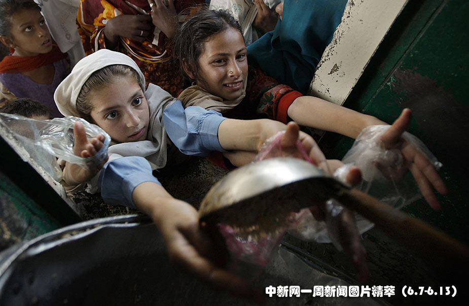 周四(10日),在巴基斯坦伊斯蘭堡的Sufi shrine Beri Iman食品分發(fā)中心,孩子們手托塑料袋接收捐贈的大米。