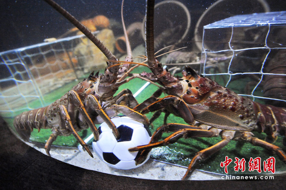 當?shù)貢r間6月15日,德國北部,水族館里的海洋生物爭搶填滿飼料的足球。
