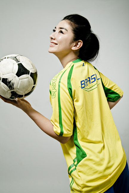 近日,黃奕身穿巴西隊(duì)球衣拍攝了一組世界杯足球?qū)懻,為南非世界杯助威喝彩?/p>