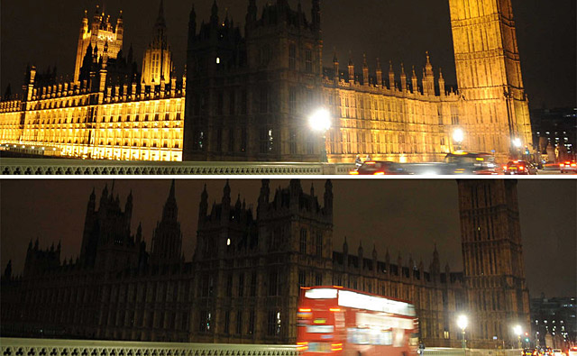 英國倫敦:3月28日,位于倫敦的英國議會(huì)大樓熄燈時(shí)和重新亮燈后的對比情況。