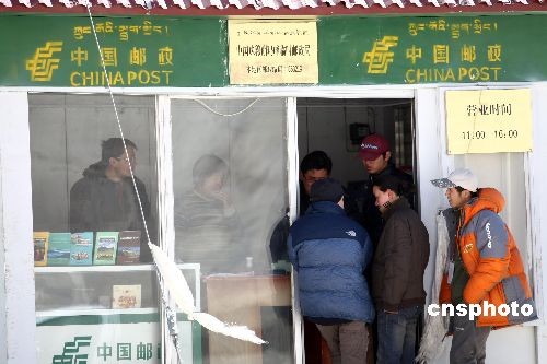 自4月28日,受邀采訪2008北京奧運會火炬接力珠峰展示活動的中外媒體入住珠峰大本營絨布新聞中心后,新聞中心住房、通訊、食宿和醫(yī)療等設(shè)施齊備且環(huán)保,為中外記者提供采訪保障。這里有世界上海拔最高的郵政代辦所,居住的活動房、電力設(shè)施、網(wǎng)絡(luò)等所使用的均是環(huán)保材料,符合珠峰自然保護區(qū)的各項環(huán)保規(guī)定。圖為記者在世界上海拔最高的郵政局-中國珠穆朗瑪峰臨時郵政局辦理業(yè)務(wù)。 中新社發(fā) 盛佳鵬 攝