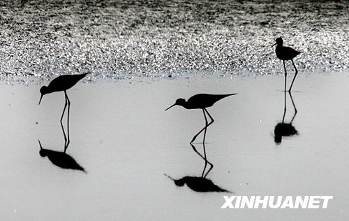 幾只黑翅長(zhǎng)腳鷸在運(yùn)城鹽湖里覓食(10月14日攝)。作者:薛俊