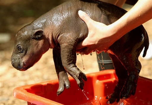 “莫尼法”的雌性侏儒河馬被人從浴盆里拿出來(lái)。