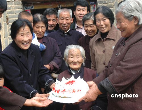 10月18日,河南省社旗縣饒良鎮(zhèn)二戶崗102歲的李秀榮老人與她的大家庭的90多位成員歡聚一堂,喜迎“重陽節(jié)”。中新社發(fā) 楊銀鵬 攝
