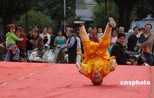 10月22日,隨鄭州市旅游局來福州推介鄭州名勝的少林寺八齡童武僧,表演武功絕活,技驚四座。時值旅游旺季,擁有少林寺、黃河風景區(qū)、杜甫故居、商城遺址公園、嵩陽書院等勝景的“河南旅游”引起福州市民關(guān)注。中新社發(fā) 鄭祚聲 攝