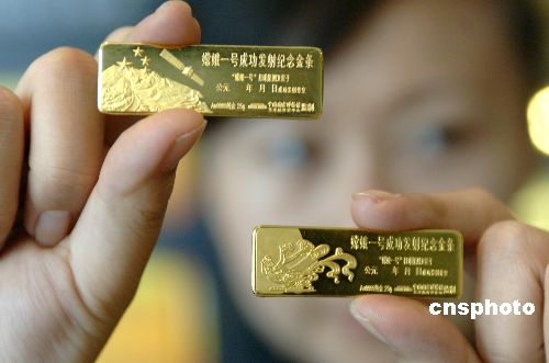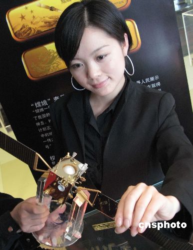“嫦娥一號(hào)”成功發(fā)射揭開了中國探月工程的序幕。為紀(jì)念這一成就,10月25日,“中國國家博物館藝術(shù)品開發(fā)中心監(jiān)制的“嫦娥一號(hào)”紀(jì)念金條在北京由國道黃金公司宣告發(fā)行!版隙鹨惶(hào)”紀(jì)念金條一套兩根,各為25克AU9999黃金,計(jì)限量發(fā)行2007套。第一根金條精雕象征中國萬里長城、五星紅旗和“嫦娥一號(hào)”在太空飛行的姿態(tài);第二根金條雕刻有嫦娥奔月的傳統(tǒng)神話圖案,寓意國人千年的夢想開始變成現(xiàn)實(shí)。金條背面雕刻的是“嫦娥”一號(hào)在太空的運(yùn)行圖。該紀(jì)念金條經(jīng)專業(yè)黃金工藝大師構(gòu)思設(shè)計(jì)完成。圖為公關(guān)員持金條在鍍金的“嫦娥一號(hào)”配送禮品前亮相。中新社發(fā) 鄒憲 攝