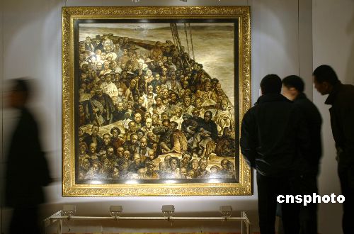十一月四日,在嘉德2007秋季拍賣(mài)會(huì)預(yù)展上,觀眾正在觀摩中國(guó)畫(huà)家程叢林的油畫(huà)《華工船》。該作品以十九世紀(jì)華工背井離鄉(xiāng)、漂洋過(guò)海的血淚史為題材,是程叢林的代表作之一。該作品將于11月6日被拍賣(mài),該作品估價(jià)超過(guò)2000萬(wàn)元人民幣。中新社發(fā) 張煒 攝