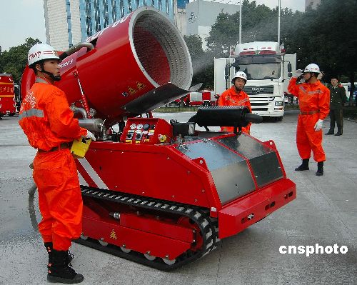11月6日,2007浙江省暨杭州市119消防日宣傳活動在杭州武林廣場啟動。10余輛消防車、云梯車、指揮車、機器人排爆車、爬行滅火坦克車等悉數(shù)亮相,其中還有價值780萬的浙江省唯一一輛多功能指揮車。在今天活動上,消防部隊亮出了所有重量級的“家底”,并現(xiàn)場展示了脈沖滅火水槍、生命探測儀等設備。群眾和部分志愿者還親身體驗了火災現(xiàn)場逃生。中新社發(fā) 引煒 攝