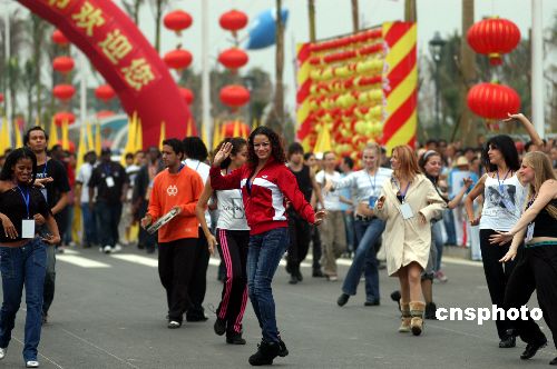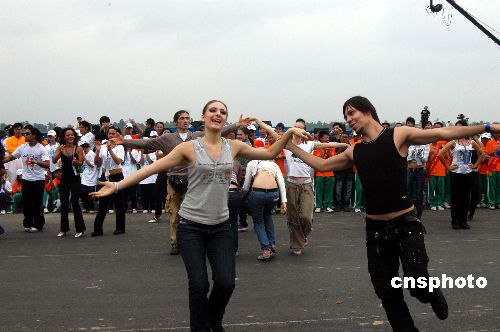2007年11月16日,外國(guó)朋友在海南瓊海跳起歡樂(lè)之舞。為期三天的第八屆中國(guó)海南歡樂(lè)節(jié)將于當(dāng)天下午開(kāi)幕,海南全省放假一天。當(dāng)天上午,出席開(kāi)幕式的各國(guó)朋友和海南各族群眾在歡樂(lè)節(jié)主會(huì)場(chǎng)情不自禁地跳起歡樂(lè)之舞。中新社發(fā) 蒙鐘德 攝
