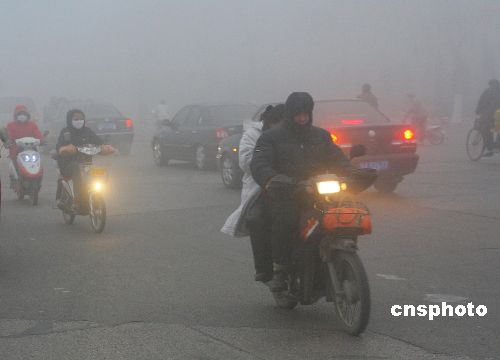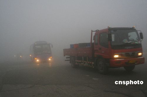 2007年11月23日,大霧籠罩下的105國道濟(jì)南平陰段,行人車輛緩緩行駛。一場大霧當(dāng)日凌晨襲擊山東濟(jì)南,能見度明顯降低,濟(jì)南市氣象臺(tái)6時(shí)40分發(fā)布大霧橙色預(yù)警信號(hào):預(yù)計(jì)未來6小時(shí)內(nèi)大部地區(qū)可能出現(xiàn)能見度小于200米的霧。受大霧影響,截止8時(shí),京福高速山東段、濟(jì)青高速、濟(jì)聊高速、濟(jì)南繞城高速等全部封閉、濟(jì)南機(jī)場所有航班均延遲。中新社發(fā) 俄國慶 攝