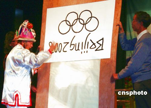 11月29日,遼寧沈陽鄭錫平在八一劇場北方老齡藝術(shù)團5周年年慶會上,用自制的自來水毛筆表演“倒著一筆”分別寫完“2008北京奧運”、“五環(huán)”、“迎奧運”等,得到與會人員的贊嘆。