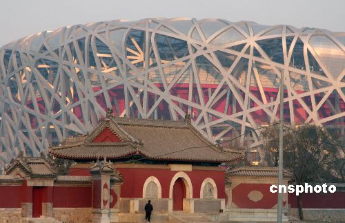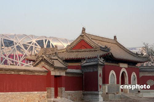 12月4日,北京奧運會主會場“鳥巢”、國家游泳中心“水立方”與附近的中國古代建筑相映成趣,宏偉的國家體育場和明代的娘娘廟讓現代與傳統(tǒng)完美結合。中新社發(fā) 吳芒子 攝