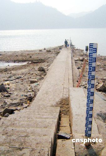 2007年12月7日,湖北宜昌江段裸露的江灘和水位標(biāo)尺。目前長江已進(jìn)入一年一度的枯水期,近期長江中游水位持續(xù)退落,比多年同期平均水位低近1.5米,根據(jù)當(dāng)前枯水形勢及水位水情特征,長江航務(wù)管理局決定,長江中游實(shí)施二級橙色預(yù)警。對通過中游的船舶吃水深度進(jìn)行規(guī)定,普通貨船實(shí)際吃水控制在2.4米及以下,危險(xiǎn)品船舶實(shí)際吃水控制在2.3米及以下,下行船舶超過吃水限制的一律在宜昌港減載。中新社發(fā) 任衛(wèi)紅 攝