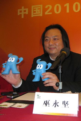 十二月十九日凌晨,臺(tái)灣設(shè)計(jì)師巫永堅(jiān)亮相中國(guó)二0一0年上海世博會(huì)吉祥物揭曉新聞發(fā)布會(huì),受到兩岸媒體追捧。巫永堅(jiān)和他的團(tuán)隊(duì)是上海世博會(huì)吉祥物“海寶”采用漢字造型的理念原創(chuàng)者,其最初設(shè)計(jì)的卡通漢字“大寶”形象,在全球兩萬(wàn)六千余件應(yīng)征作品中脫穎而出,巫永堅(jiān)被媒體譽(yù)為“海寶的爸爸”。上海世博會(huì)最終揭曉的吉祥物“海寶”形象,經(jīng)由“海派”設(shè)計(jì)名家邵隆圖及其團(tuán)隊(duì)的再創(chuàng)作,兩岸攜手使“大寶”定格為“海寶”。中新社發(fā) 裔蕊華 攝
