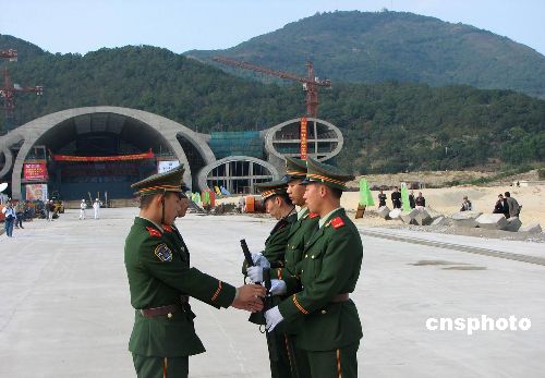 十二月二十四日,“南海一號”靠近碼頭等待漲潮后登陸,中國海事巡邏船、公安邊防艇在海上層層保衛(wèi),同時,警戒線已經在岸上的博物館兩翼撒開,嚴禁無關人員進入。圖為在海上絲綢之路博物館前執(zhí)勤的武警。中新社發(fā) 索有為 攝