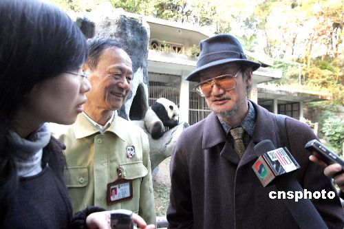 圖為東野義之教授在參觀完熊貓世界后接受媒體采訪。