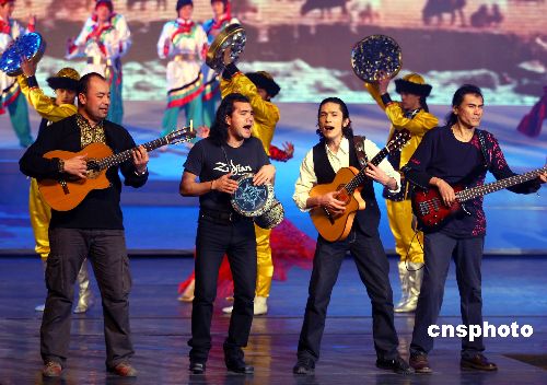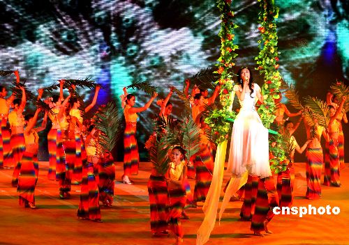 2007年12月31日晚,中國(guó)中央電視臺(tái)在北京舉辦2008年元旦雙語(漢語、英語)晚會(huì),中國(guó)及日本、韓國(guó)、泰國(guó)、馬來西亞、新加坡、印度等國(guó)家的藝術(shù)家同臺(tái)獻(xiàn)藝,歡度新年佳節(jié),他們以歌曲、舞蹈、雜技、魔術(shù)、服裝秀、戲曲等藝術(shù)形式,祝福各國(guó)人民愉快。中新社發(fā) 宋吉河 攝
