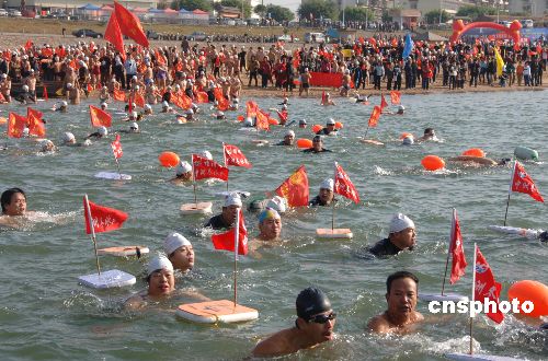 1月1日是全國冬泳日,福州市冬泳協(xié)會組織的千余名冬泳健兒,從福州閩江公園西河園入水,往返橫渡閩江,以此迎接新年的到來。中新社發(fā) 鄭祚聲 攝