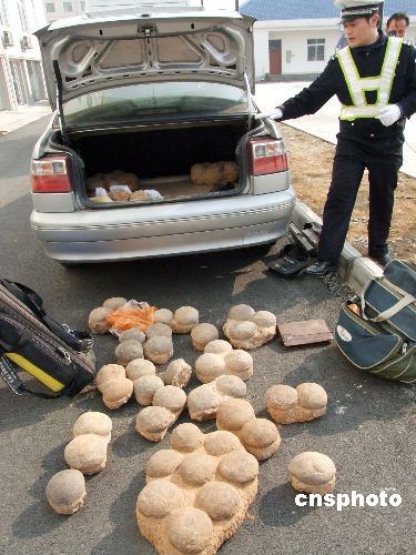 1月5日上午,湖北高速公路交警十二大隊巡警在樊魏高速公路查獲一輛運載有55枚恐龍蛋化石的十堰籍小轎車,據(jù)司機(jī)官某稱,他正準(zhǔn)備把這些恐龍蛋化石運往上海。目前,官某已被高速公路巡警移送到襄樊市公安局襄城分局隆中派出所留置審查。中新社發(fā) 李得榮 攝