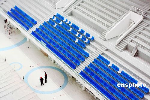 圖:北京“水立方”安裝座椅迎接月底首場(chǎng)賽事