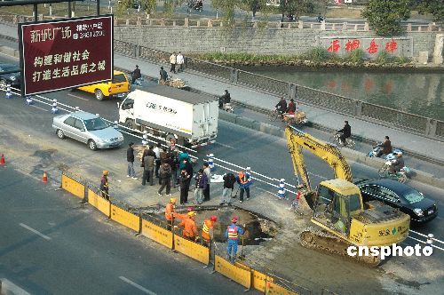 1月7日,杭州艮山運(yùn)河橋機(jī)動(dòng)車(chē)道橋面發(fā)生局部坍塌事故,坍塌形成的窟窿直徑約5米,深約2米,面積達(dá)30多平方米,所幸沒(méi)有造成人員傷亡和車(chē)輛受損,但對(duì)交通造成較大影響,具體原因尚待有關(guān)部門(mén)調(diào)查。據(jù)了解,艮山運(yùn)河橋始建于1988年,由于交通流量較大,曾多次進(jìn)行過(guò)比較全面的修繕和拓寬,該橋曾發(fā)生過(guò)橋面人行道突然坍塌導(dǎo)致行人墜落的事故。中新社發(fā) 引煒 攝