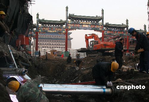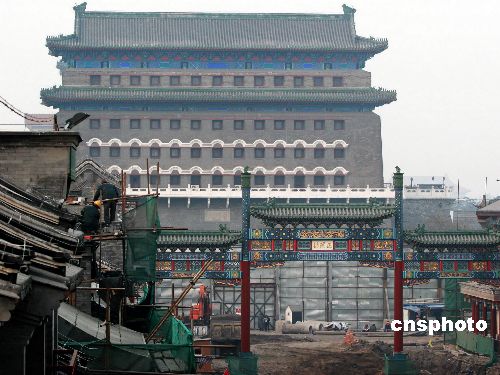 1月7日,北京前門步行街在寒冬中加緊施工。前門大街修繕整治后將恢復(fù)清末民初的建筑風(fēng)貌,成為傳統(tǒng)與現(xiàn)代相結(jié)合的步行街。位于前門大街正陽門前的五牌樓已基本完工,亮出真容。中新社發(fā) 富田 攝