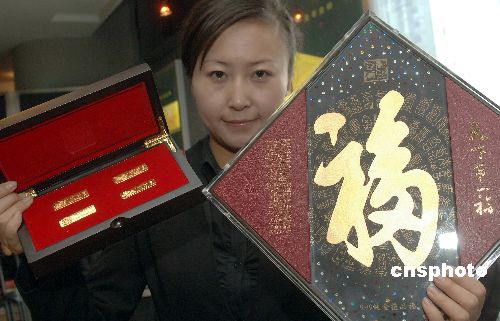 1月8日,由國道黃金發(fā)行的“中國純金壓歲錢”(禮盒)、 “中國春節(jié)金條”、“純金天下第一福”等貴金屬產(chǎn)品在北京上市。“中國春節(jié)金條”是一款春節(jié)氣息濃郁的賀歲產(chǎn)品,包含4根20克的金條,以最具春節(jié)代表性的餃子、爆竹、年畫、湯圓為主圖案,傳達(dá)這些春節(jié)元素的由來、歷史故事。“純金天下第一!币郧宄滴趸实塾诠1673年為祖母孝莊太后“請福續(xù)壽”而書寫的“!弊(被稱為“天下第一福”)為主題,以純金為材質(zhì)。中新社發(fā) 鄒憲 攝