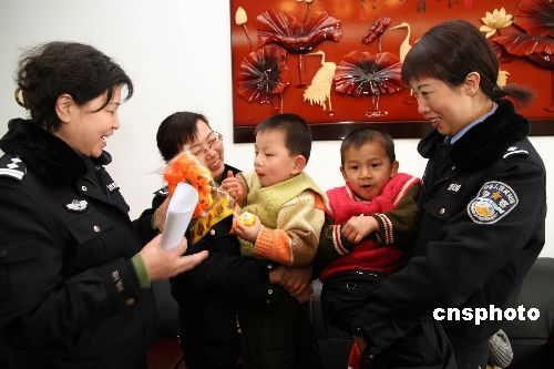 1月10日,沈陽市公安局社區(qū)警務(wù)支隊(duì)民警到市兒童福利院為無戶口的31名棄嬰解決戶口問題,并送去落戶手續(xù)。社區(qū)警務(wù)支隊(duì)的民警還為孩子們送去了精心選購的各種禮物。這些被遺棄的孤兒,多數(shù)無法查找到他們的身源,沒有戶口就如沒有一個合法的公民身份。為了不影響這些孩子今后的成長、生活、學(xué)習(xí)、就業(yè)。沈陽市公安局社區(qū)警務(wù)支隊(duì)采取特事特辦的方式,解決棄嬰們的后顧之憂。到目前為止已為263名棄嬰辦理了落戶。中新社發(fā) 黃金昆 攝